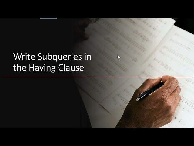 Get the course today at: https://www.udemy.com/course/sub-query-magic-write-t-sql-subqueries-using-sql-server/?couponCode=YOUTUBE202212 You can use sub queries in you SQL’s HAVING clause to filter out groups of records. Just as the WHERE clause is used to filter rows of records, the HAVING clause is used to filter groups. Because of this, it becomes very useful in filtering on aggregate values such as averages, summations, and count. The power of using a subquery in the HAVING clause is now you don’t have to hard-code values within the comparisons. You can rely on the subquery’s results to do so for you.